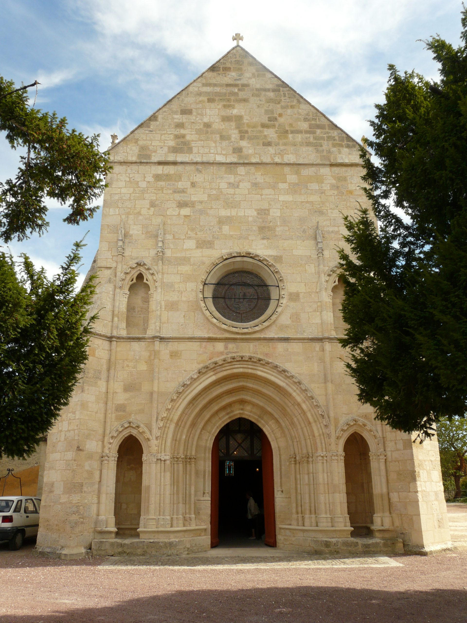 Au niveau supérieur s’ouvre un large oculus central qu’encadrent ici encore des niches, peu profondes, voûtées en berceau brisé, ouvrant par des baies couvertes d’arcs trilobés et inscrites dans des arcatures en arc brisé à archivolte ornée de motifs végétaux. Des pinacles encadrent ces arcatures formés de colonnes à chapiteaux, décorés de têtes d’hommes et d’animaux et surmontés d’un couronnement pyramidal. Une fine moulure sépare ce niveau du pignon à rampants couverts, amortis à la base par deux pinacles. L’élévation sud de la nef est marquée en son centre par la présence de trois contreforts, se jouxtant, qui délimitent les travées. Ces dernières sont éclairées par une haute baie en plein-cintre. Au dessus des contreforts on note la présence d’un étroit jour qui éclaire l’espace compris entre les voûtes et la toiture. La porte rectangulaire s’ouvre sur le plan occidental du “transept-clocher”, un bandeau plat sépare le rez-de-chaussée du niveau supérieur, interrompu du côté sud par la présence d’un grand oculus à réseau polylobé.