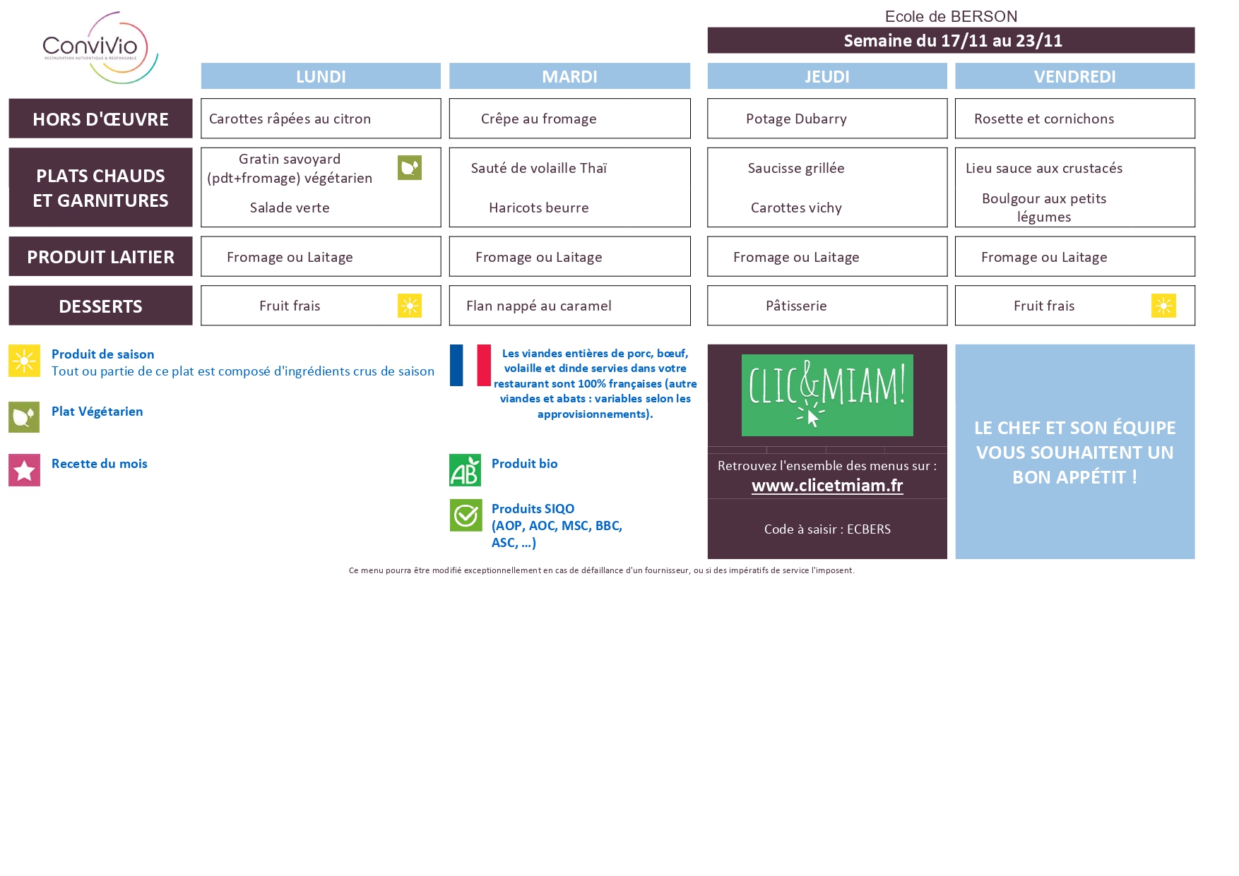 Les repas servis sont fournis par un prestataire extérieur, Convivio, dont 2 agents sont responsables de la cuisine à l’heure du repas. Elles râpent, émincent, mijotent les matières premières qui sont commandées et livrées sur place.